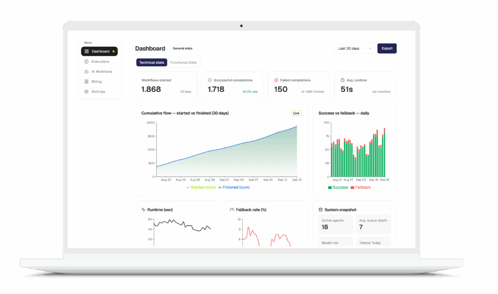 We personally stand behind our promise of fast and lasting impact from AI‑driven process automation. Together we define the target process and KPIs, deliver a proof of value in 4–8 weeks, and scale in a controlled way to further workflows.