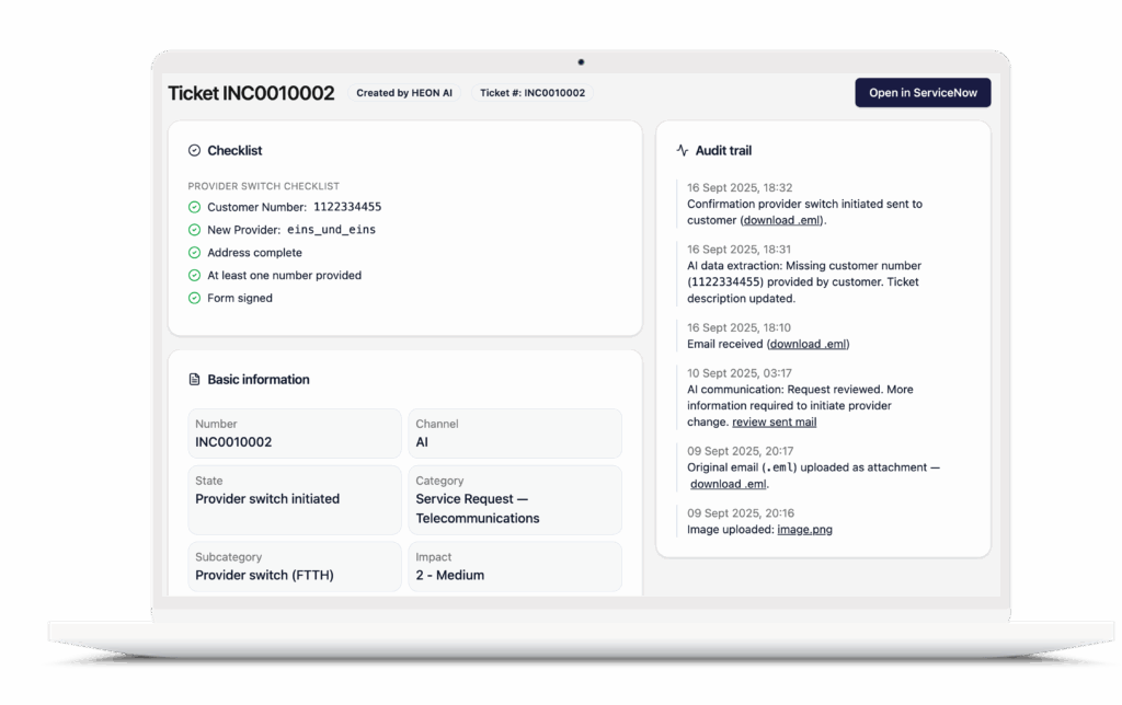 HEON AI integrates with your IT, automates end‑to‑end and delivers measurable ROI within weeks – with governance, audit trail and human‑in‑the‑loop built in. No new silo, no months‑long data consolidation, no deep system rebuilds.